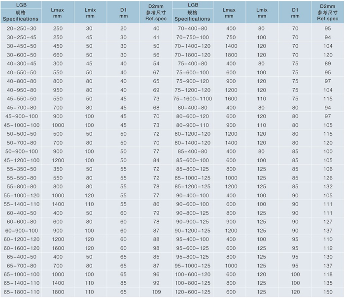 D1-保護(hù)套小端內(nèi)徑=dmaz+10毫米 D2-保護(hù)套大端內(nèi)徑 D3-大端法蘭內(nèi)徑=D2+6~8毫米 D4-小端法蘭外徑=D1-1~2毫米 dmax-被保護(hù)零件的較大直徑 Lmin-較小壓縮長(zhǎng)度 Lmax-較大延伸長(zhǎng)度 L-較大允許行程